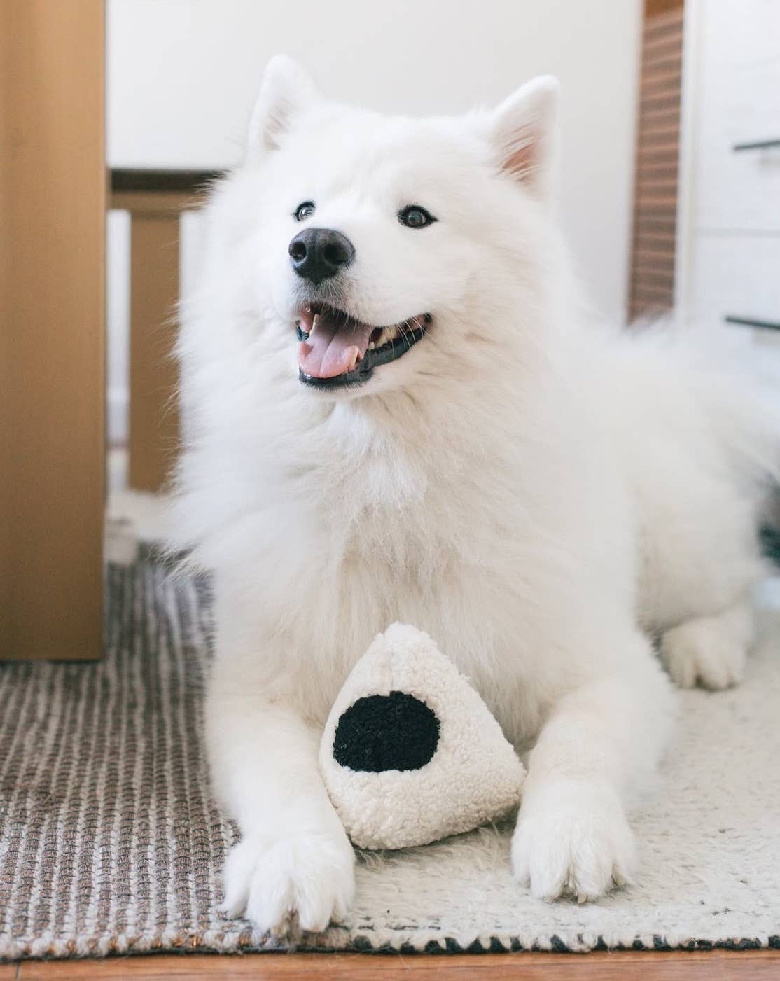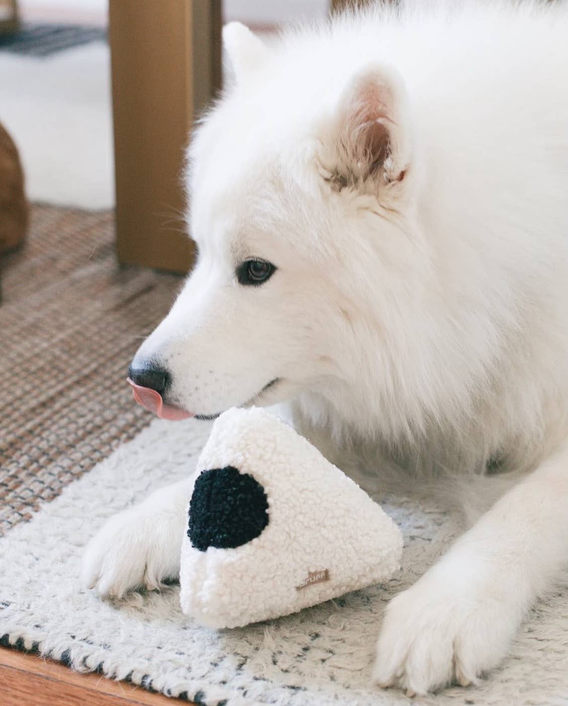 Our Modern Minimalist Dog Toy: The 3D Spotted Triangle is made from our classic boucle fabric with a squeaker in center. This neutral colored dog toy is fun for tossing and bouncing around. This play object is 5” x 5” inches in size and something you don’t mind seeing laying around the house!