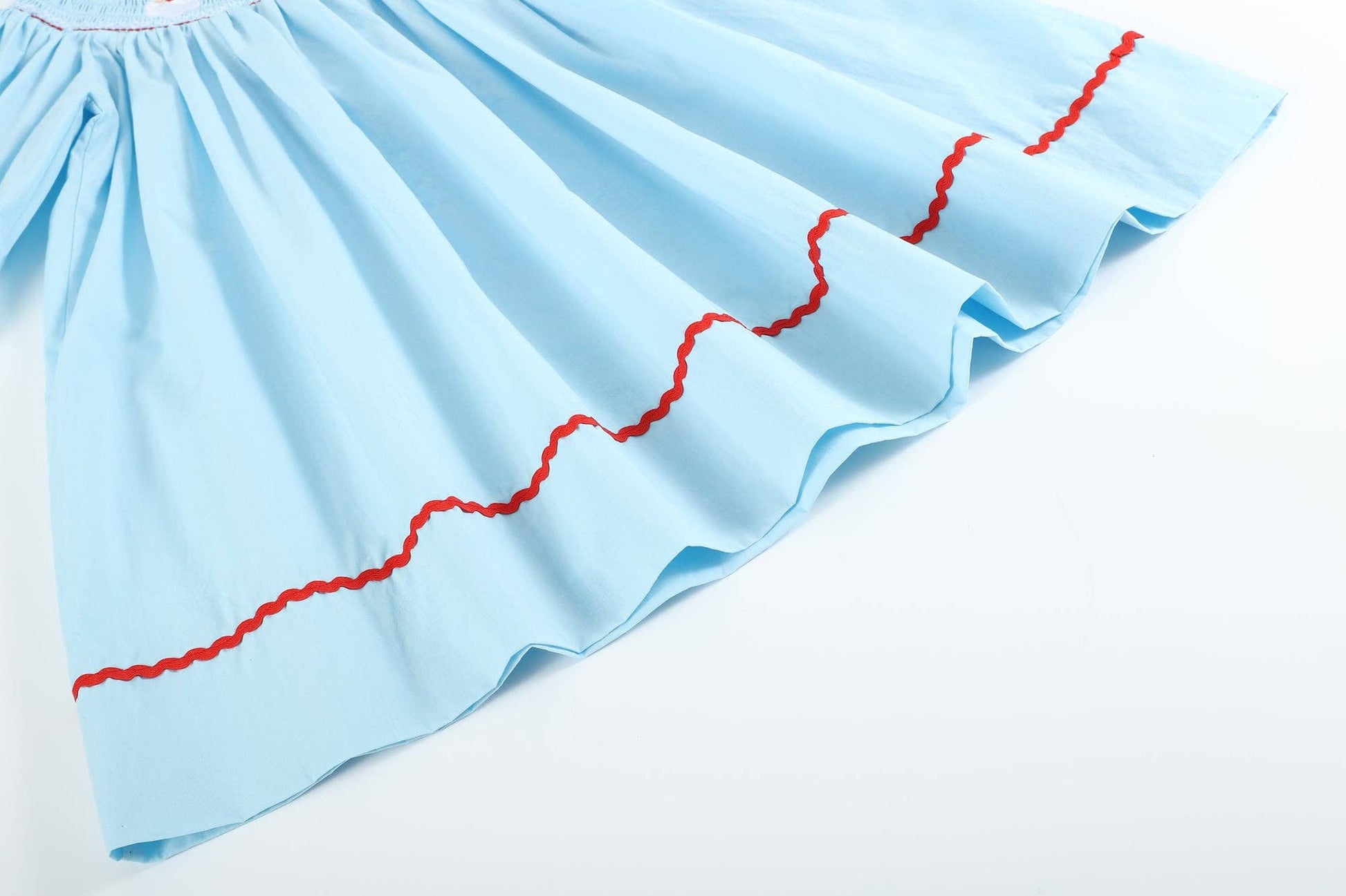 Dress your little one in holiday charm with the Blue Santa Smocked Bishop Dress. This delightful dress features intricately embroidered Santas along the neckline, adding a festive touch to its classic smocked design. Accented with red rick rack trim details, this dress is perfect for celebrating the season in style. Ideal for holiday gatherings, it's both adorable and comfortable for your little girl. From getting photos with Santa to decorating the tree; no matter the occasion she will be looking picture-perfect!