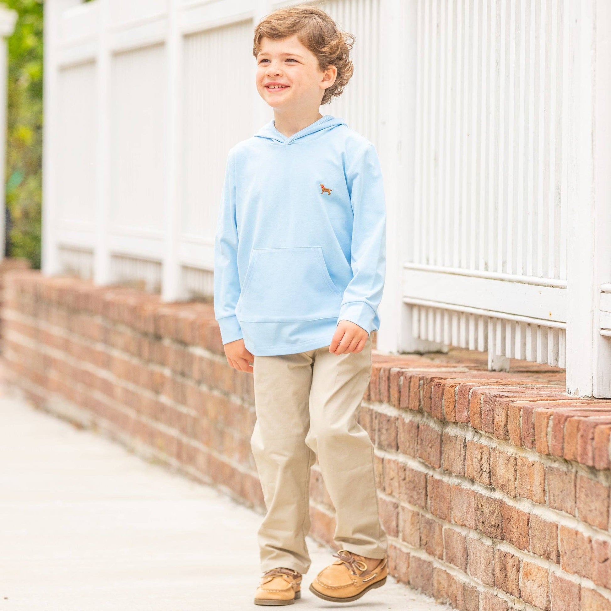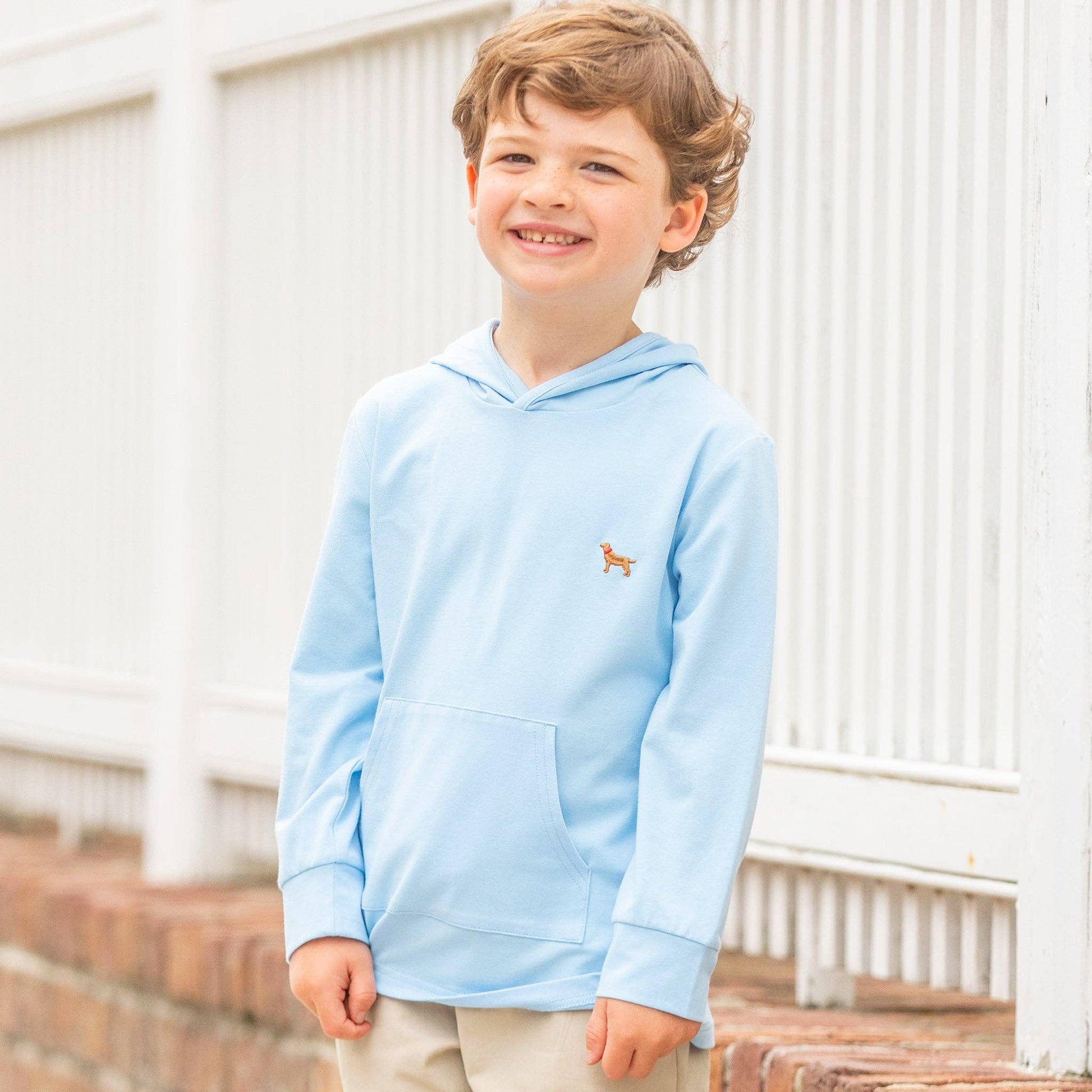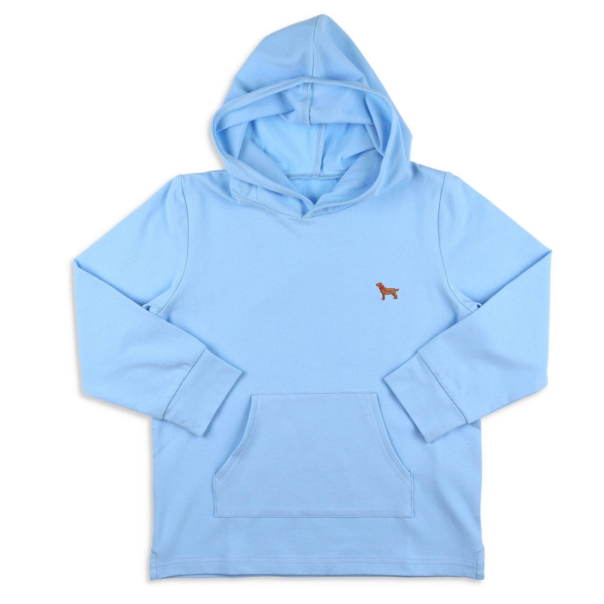 This boys classic, soft ocean blue, long sleeve, hoodie by Serendipity will be a wanted addition for any fall or winter adventure, especially that fall football game. The front, handy, kangaroo pocket and the favorite dog embroidered logo just increases the desirability of this outerwear.