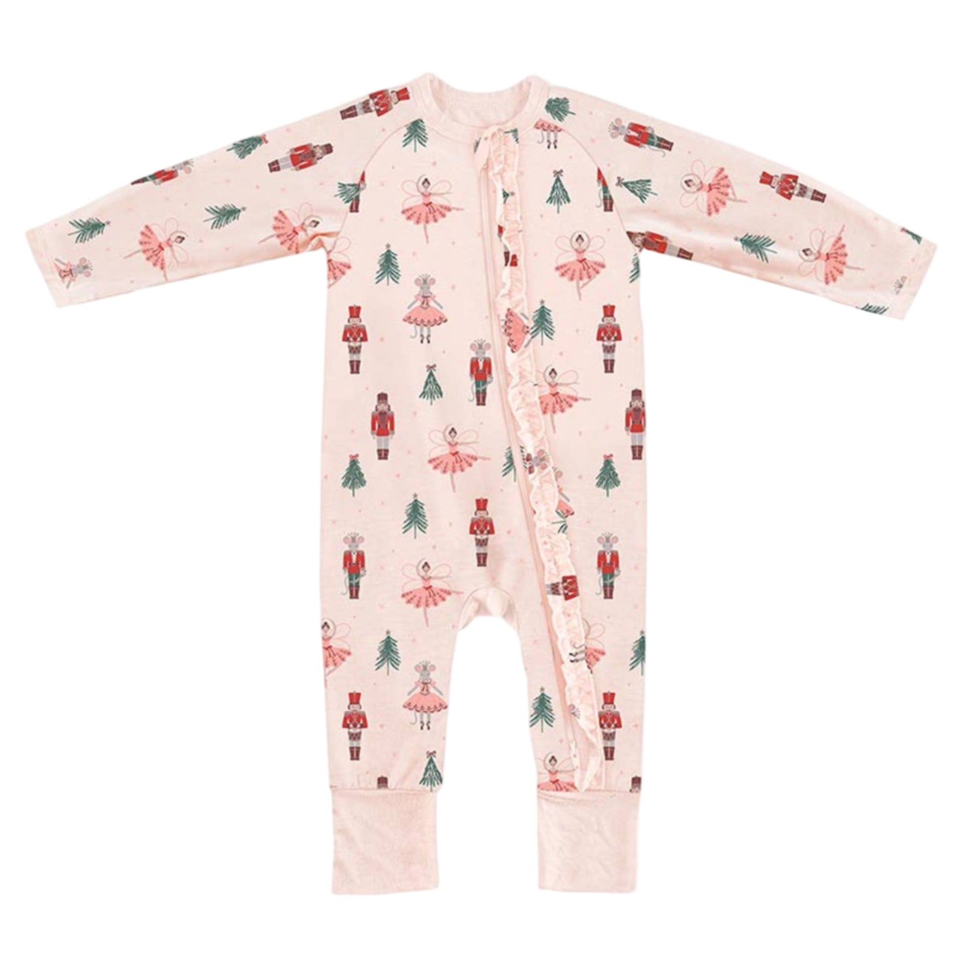 Perfect for holiday snuggles, this cozy romper features an enchanting Nutcracker design and adorable ruffle detail on back. Thoughtful gift for baby's first Christmas!