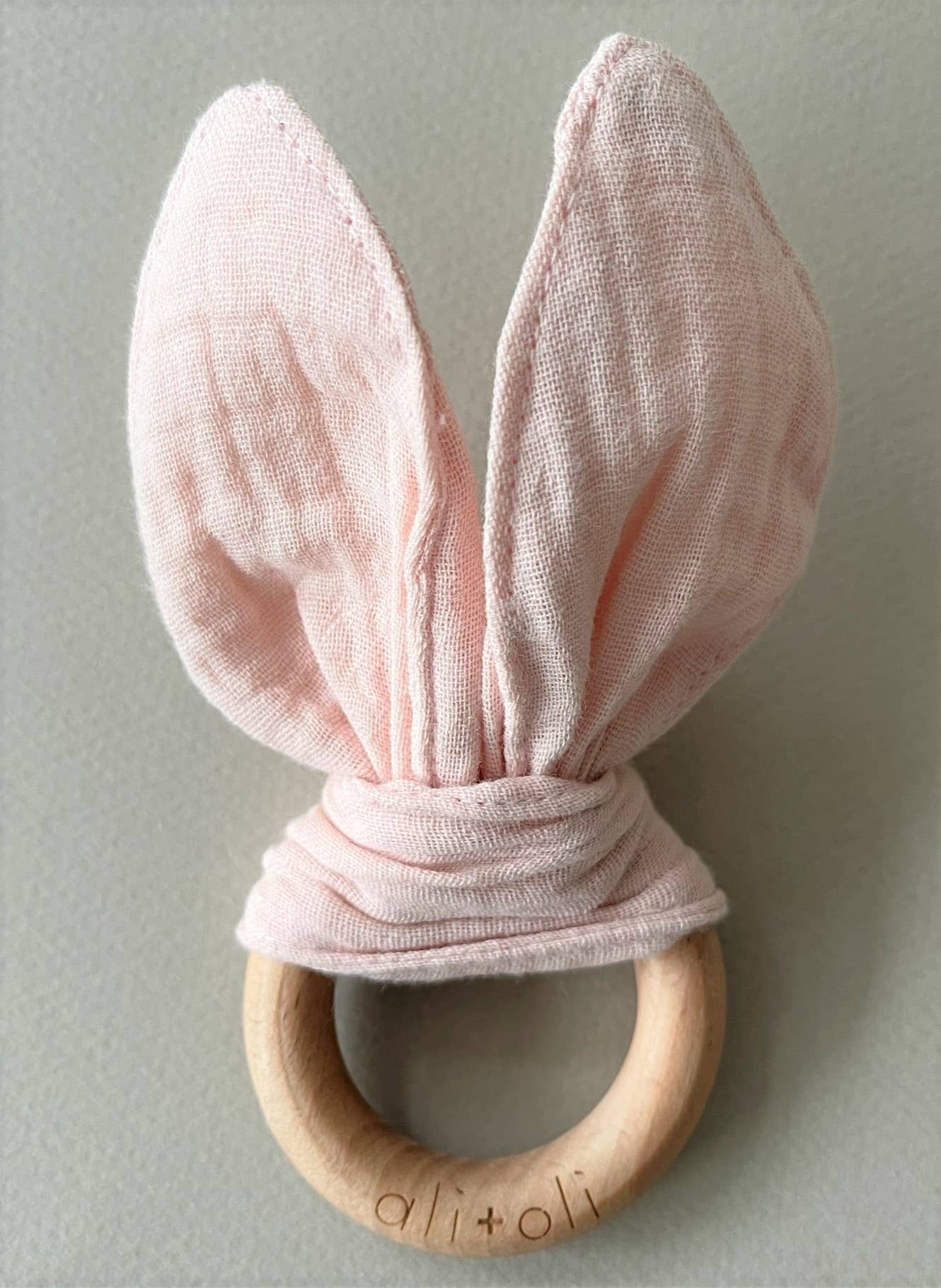 Crinkle Bunny Ears Wooden Ring Teething Toy for Baby (Pink)