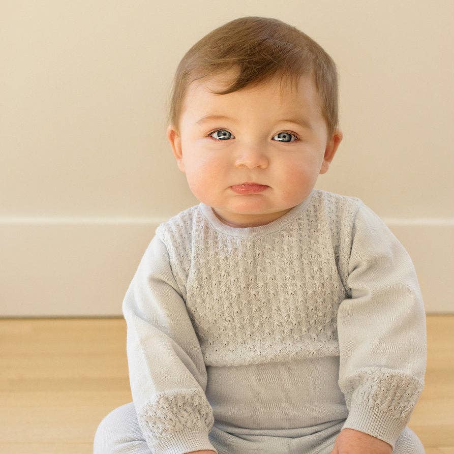 The Diamond Knit Longall is cute and oh so cozy, perfect for keeping your little one warm without compromising on style. This classy baby outfit features diamond knit at the top and along the sleeve edges, as well as ribbed knit lining the neck, sleeve, and leg cuffs. When your little prince needs to look his best, go with a Feltman Brothers baby outfit - you'll be glad you did!