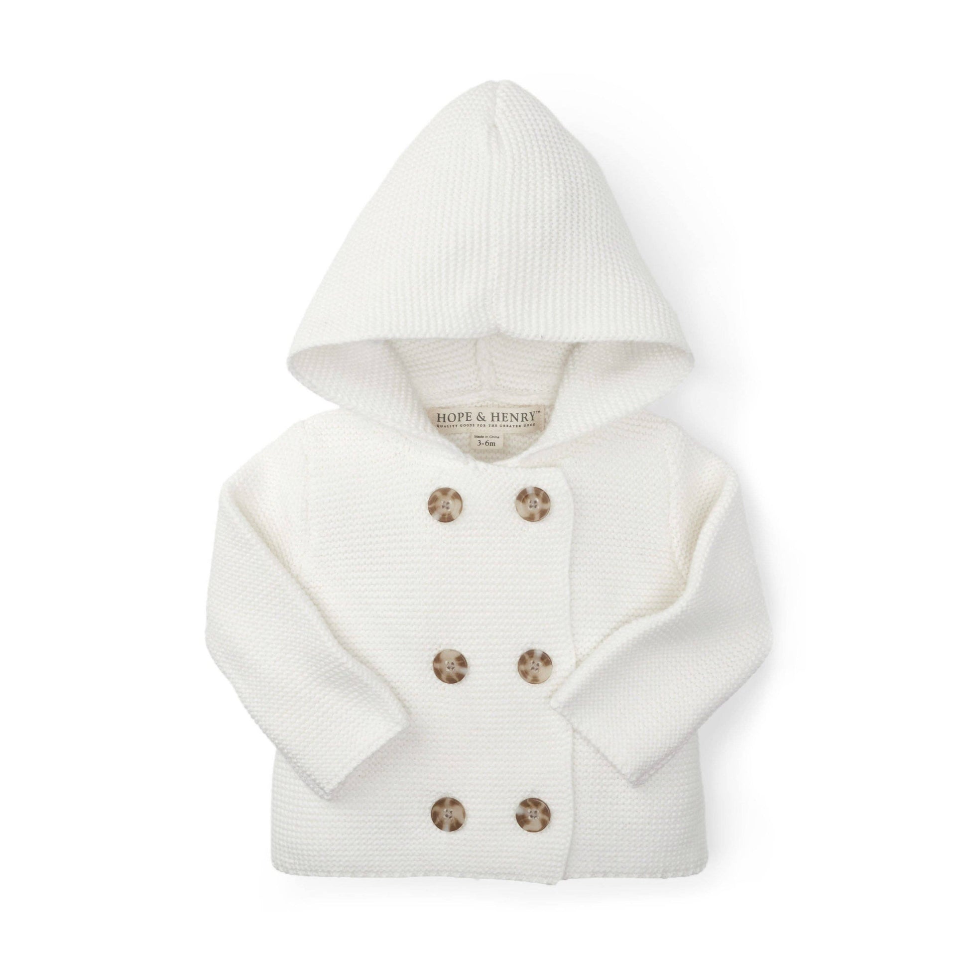 Keep your little one snuggly soft and picture ready in this absolutely adorable hooded sweater made from beautiful organic cotton. Perfect for both baby boys and baby girls, the double breasted button front closure and lofty seed stitch create a sophisticated look. It layers easily and makes a wonderful gift!