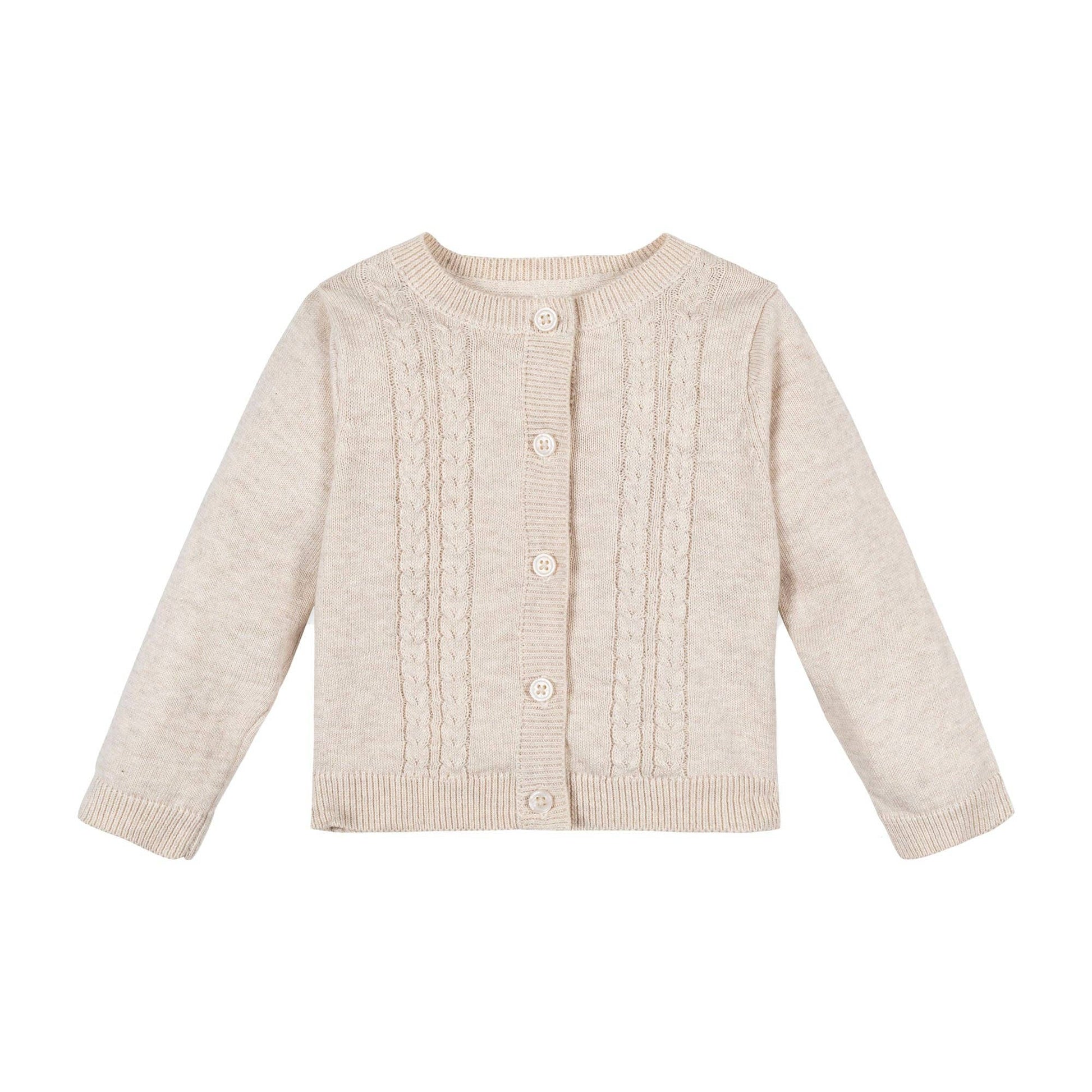 Our sweet matching sweater set in soft organic cotton features a long sleeve cardigan and a cozy legging to keep baby warm. A delicate cable stitch adorns the cardigan and features a pearlized button front closure. Legging has an easy pull-on elastic waist. The perfect baby shower gift or heirloom piece for your family.