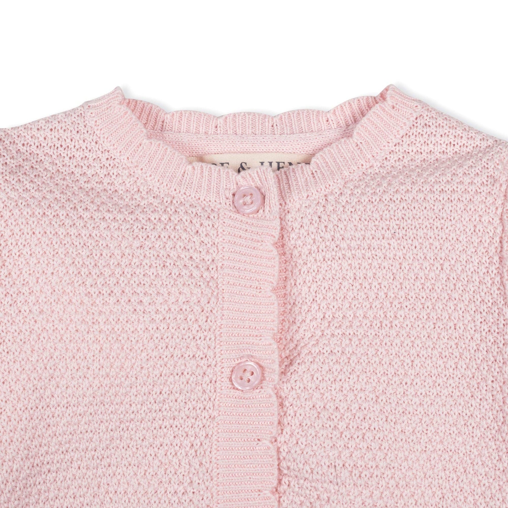 Our sweet matching sweater set in a soft organic cotton seed stitch features a long sleeve cardigan and a cozy legging to keep baby warm. Delicate scallop edge trim and front pockets adorn the cardigan which has a pearlized button front closure. Legging has an easy pull-on elastic waist with decorative drawcord. The perfect gift.