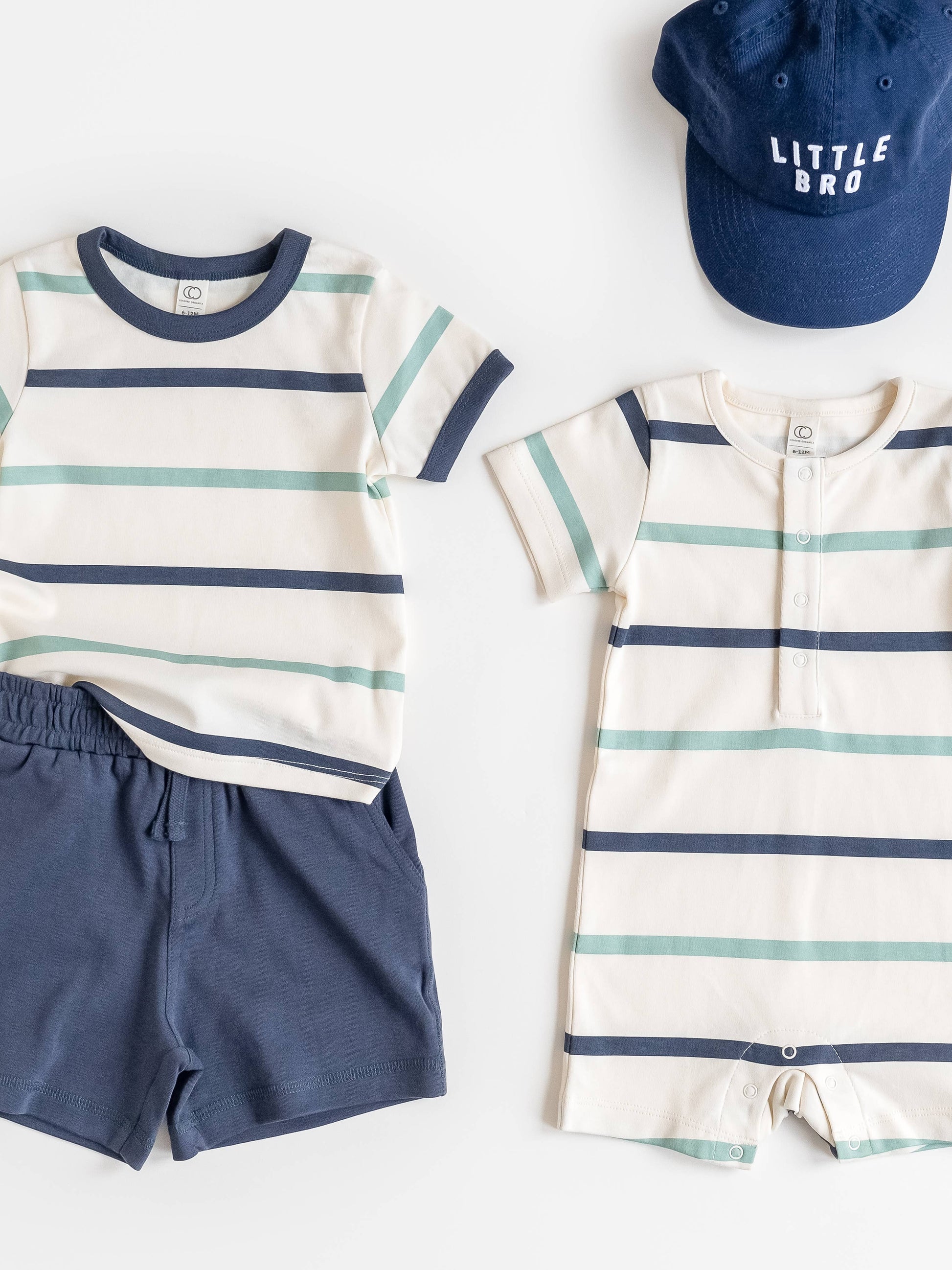 Organic Mason Short Sleeve Romper - Aldo Stripe/Navy + Jade