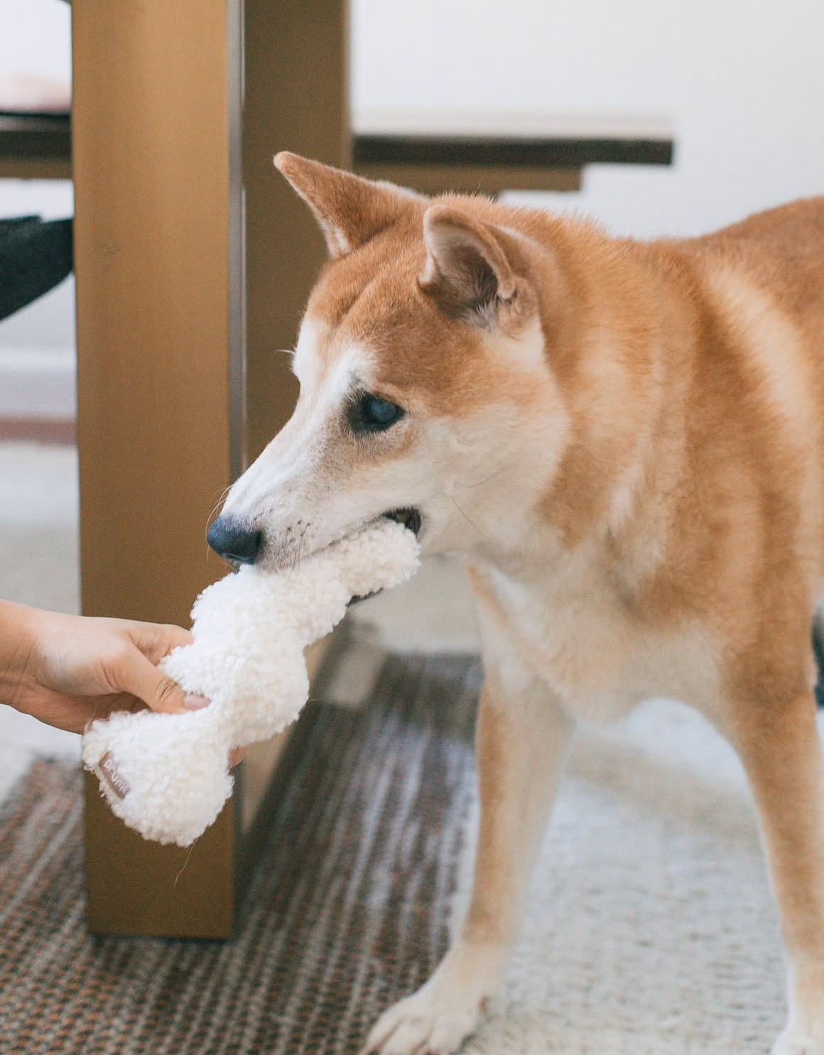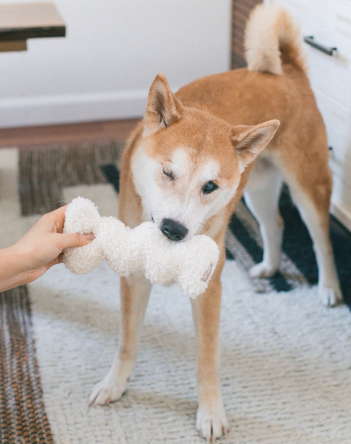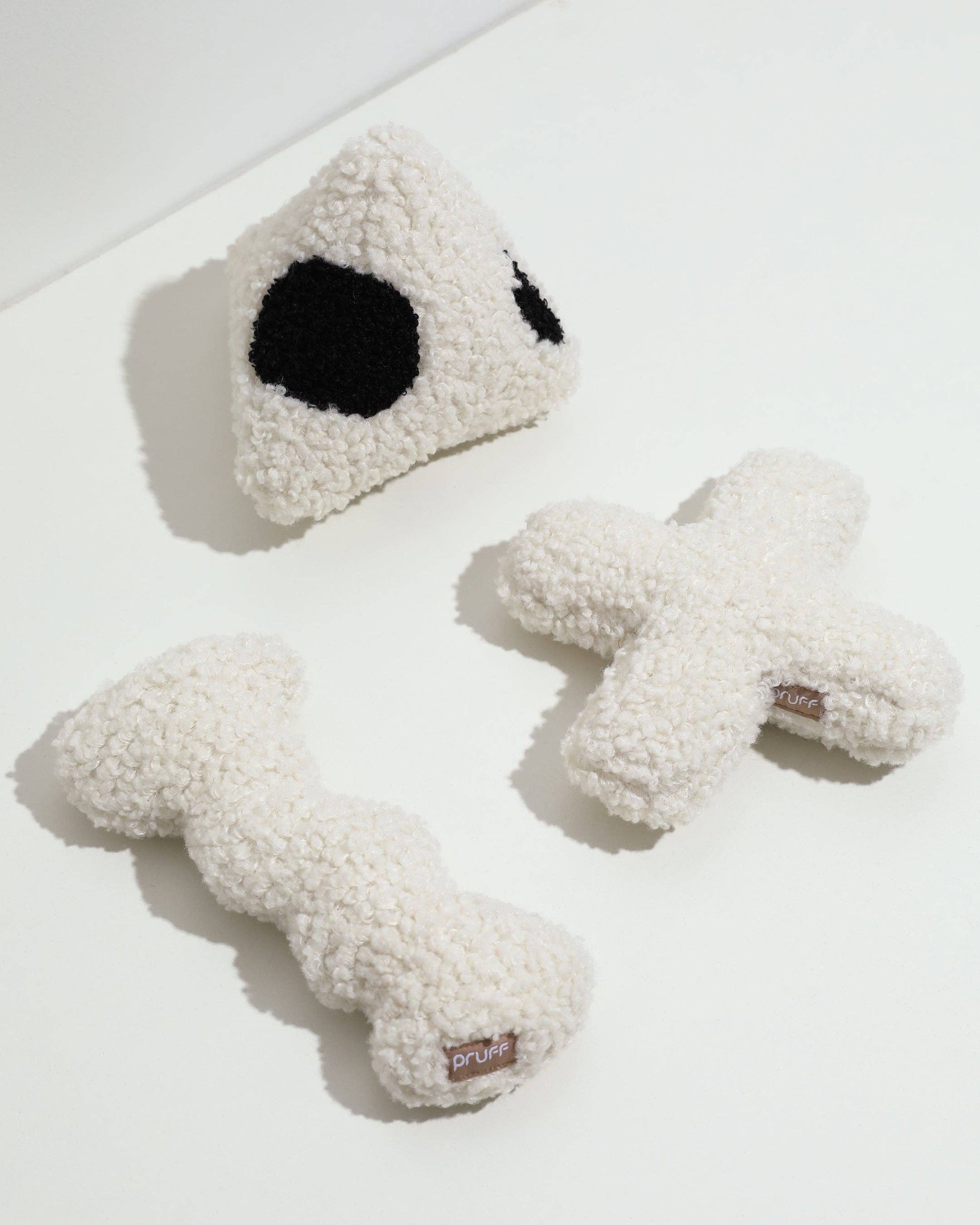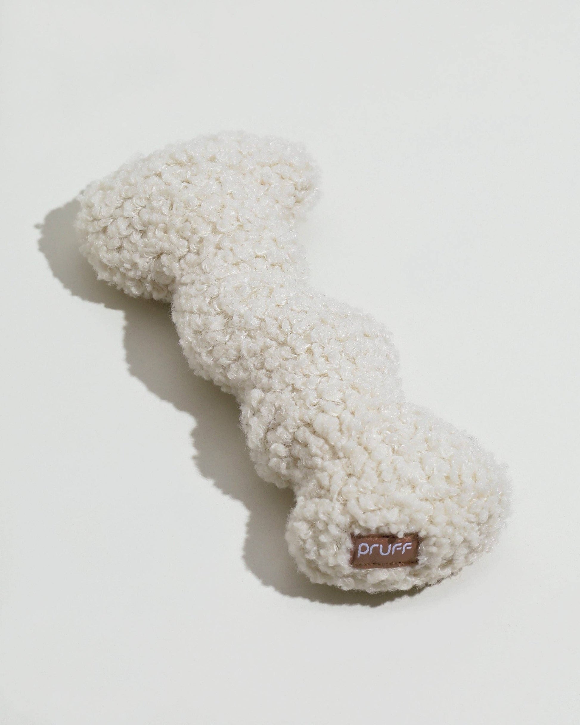 Our Modern Minimalist Dog Toy: The original and favorite squiggle shape! Made from classic Pruff boucle fabric with crinkle inside. This neutral colored dog toy is 8.5” long by 4” wide and looks like a little piece of art on your floor.
