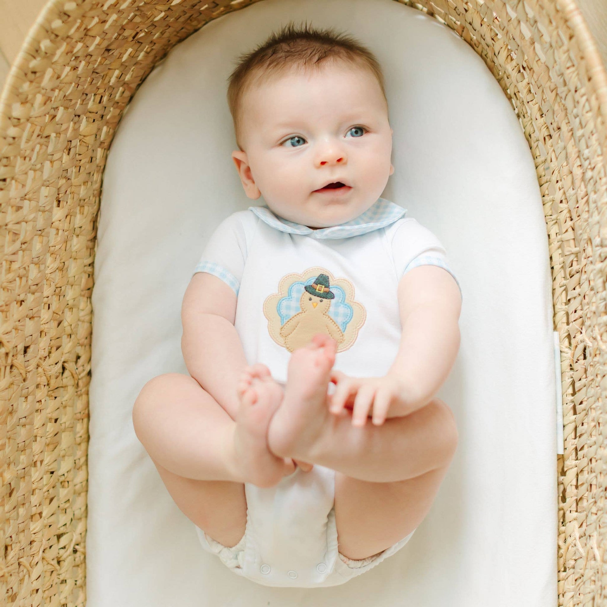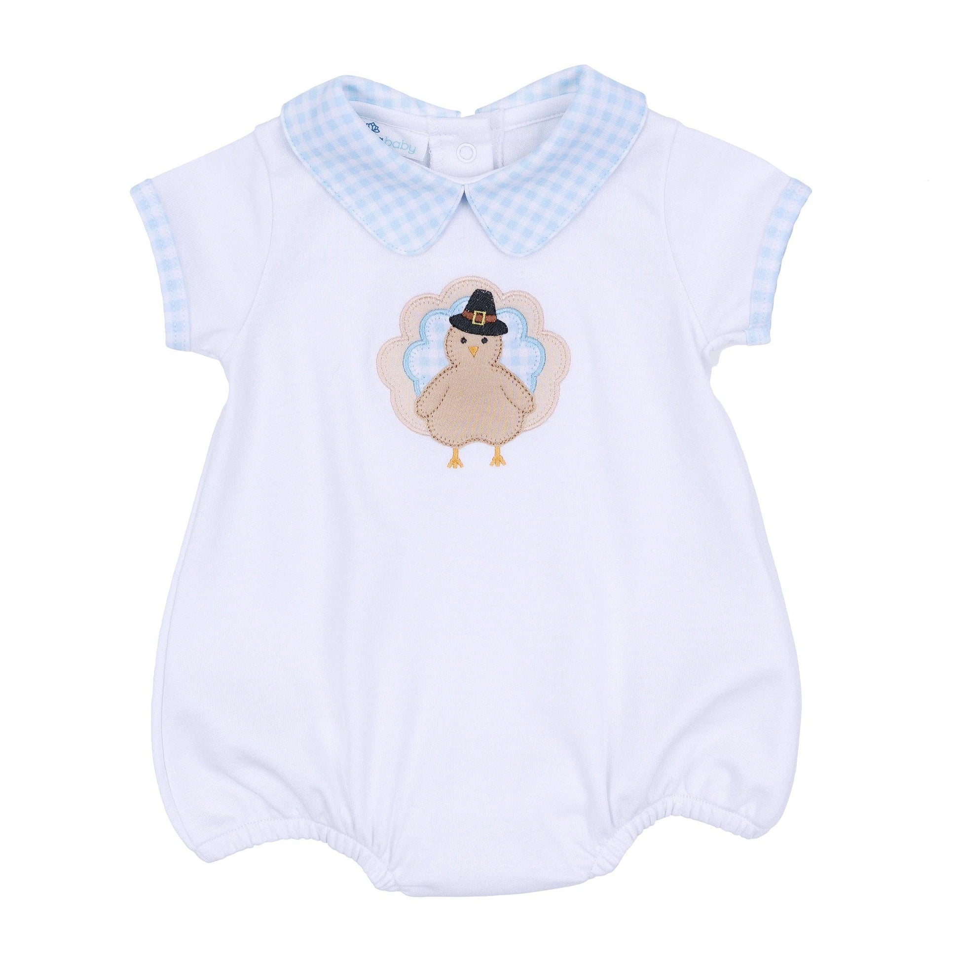 Celebrate Thanksgiving in adorable style with our Pilgrim Pals Applique Collared Short Sleeve Bubble! Inspired by the Thanksgiving holiday and the imagery of Pilgrims and the fall harvest, this charming bubble features a delightful turkey appliqué on luxurious Pima Cotton, perfect for your little boy.