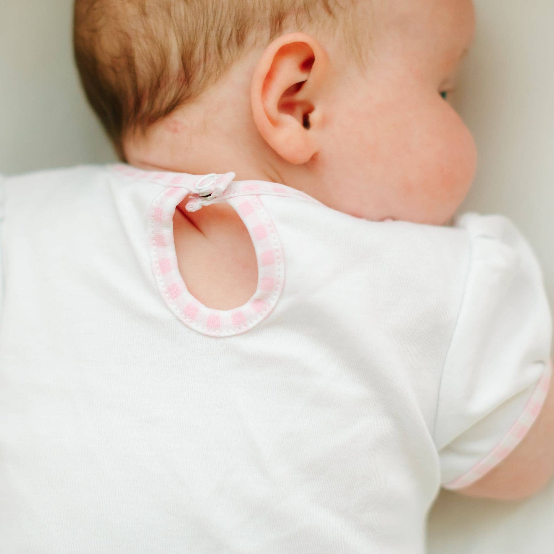 * Gingham Trim: Provides charming pink gingham accents on the top and diaper cover.