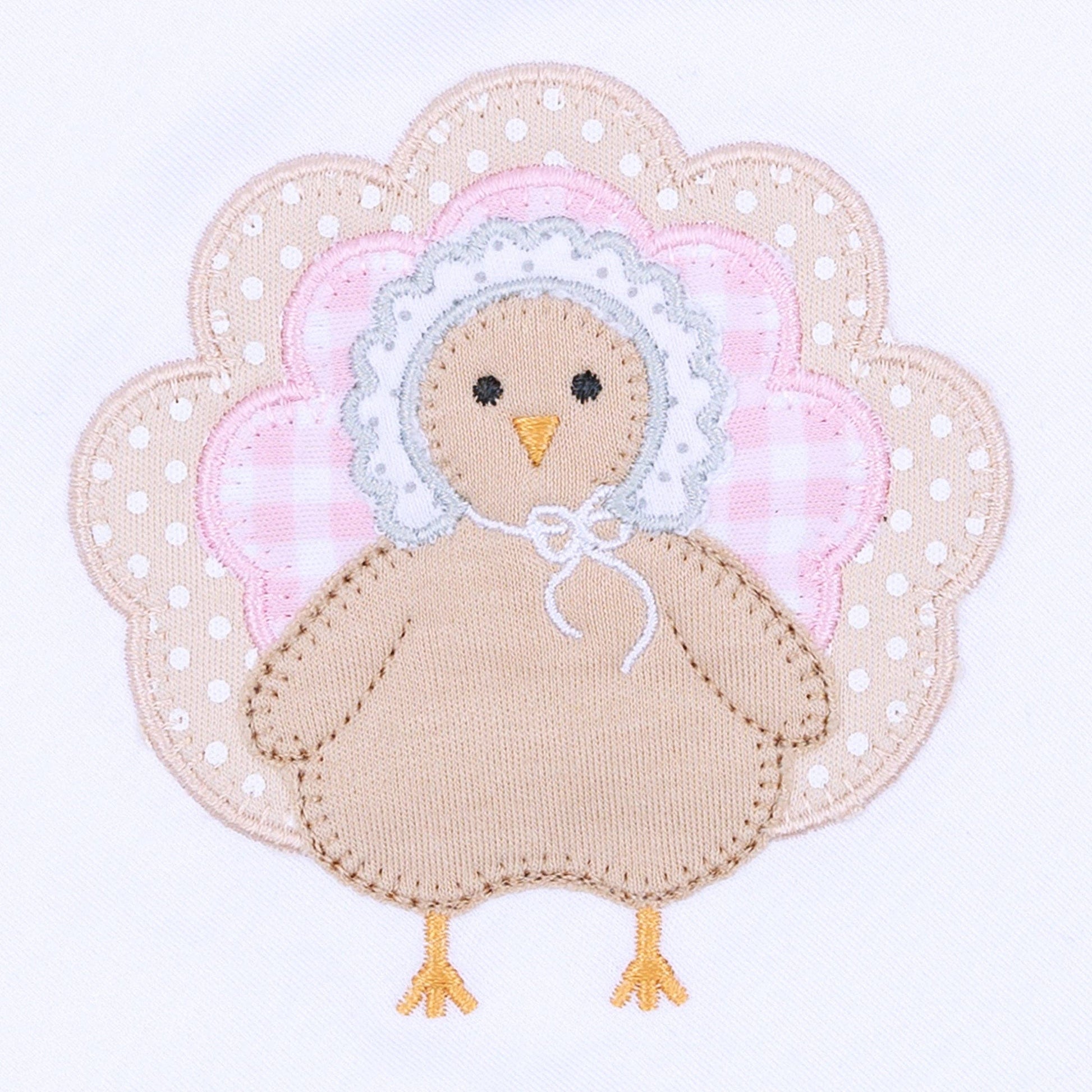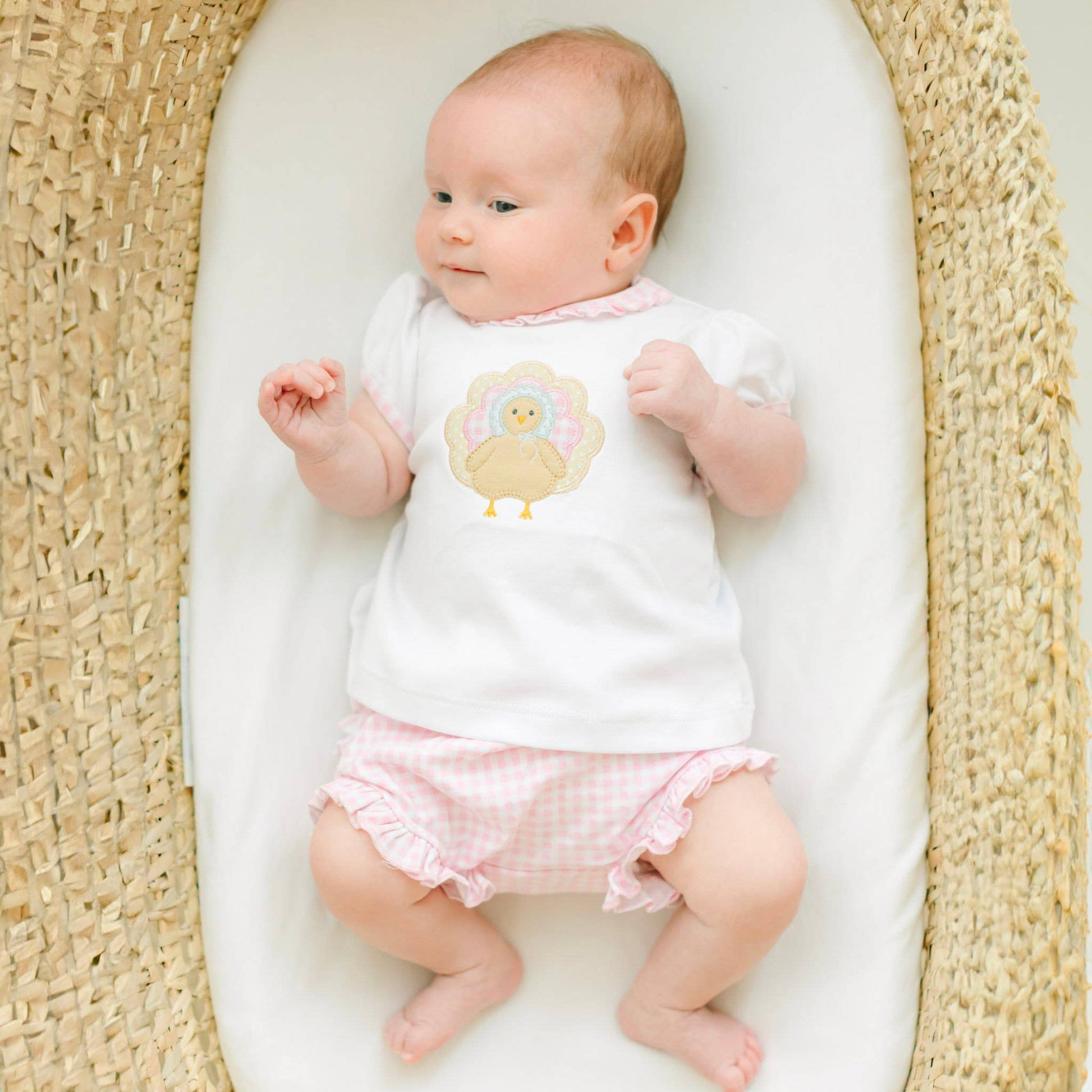 Celebrate Thanksgiving in adorable style with our Pilgrim Pals Applique Ruffle Diaper Cover Set! Inspired by the Thanksgiving holiday and the imagery of Pilgrims and the fall harvest, this charming set features a delightful turkey appliqué on luxurious Pima Cotton, perfect for your little girl.