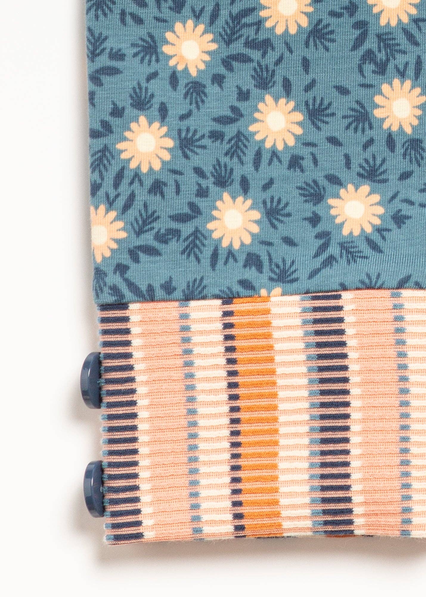In a cool shade of blue and dotted in a ditsy floral, the Pink Posy Leggings are here to keep your favorite dresses in rotation as the temps drop. With striped cuffs and navy buttons, these full-length, jersey knit bottoms are made to match the Woodland Wanderer Dress and Royal Plum Dress.