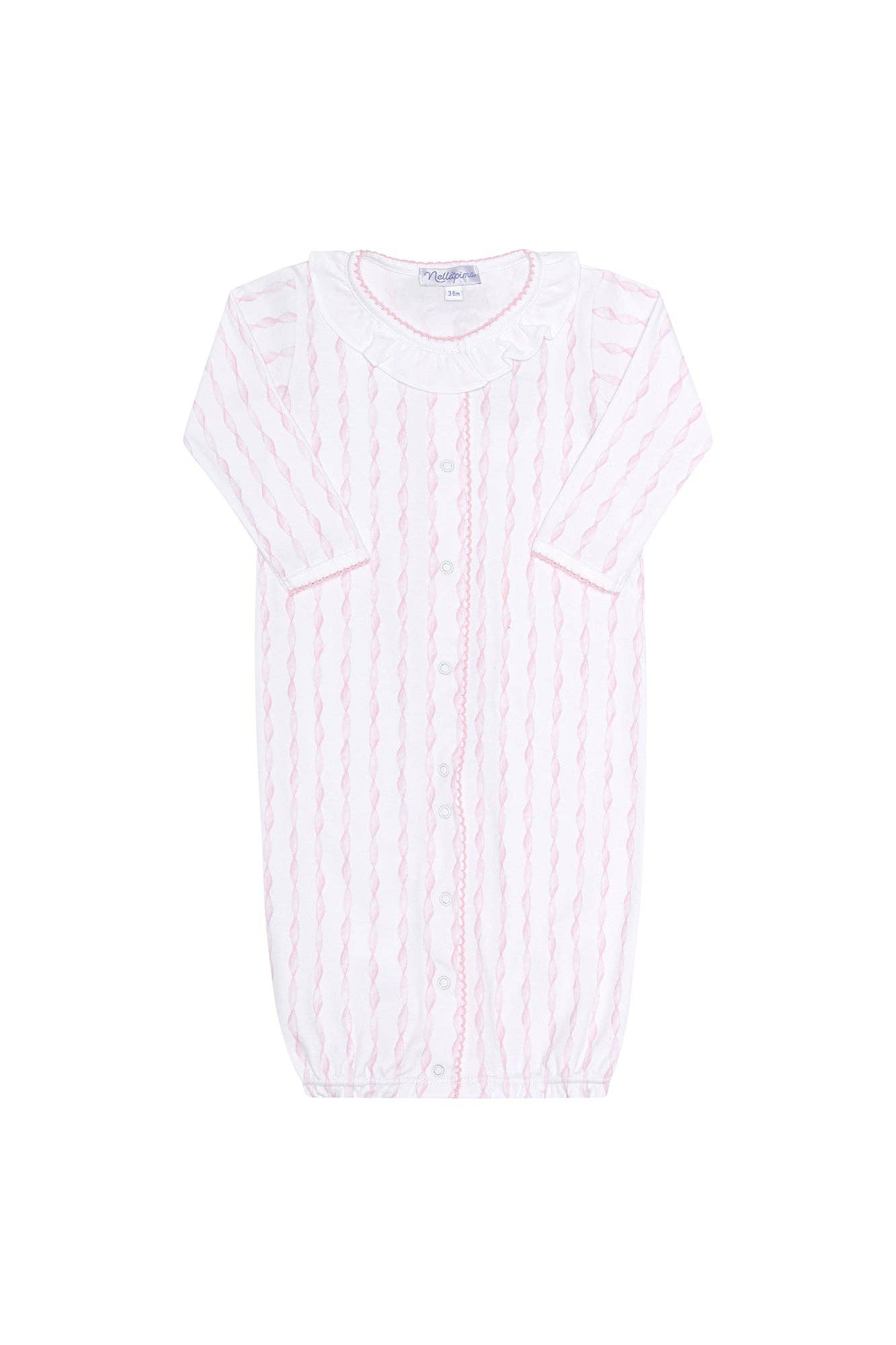 100% Pima cotton for ultimate softness Delicate pink twirl pattern Pristine white collar Elegant pink trim on hands and button area Converts from gown to romper for versatile use Easy snap closures for quick diaper changes Perfect for day and night wear