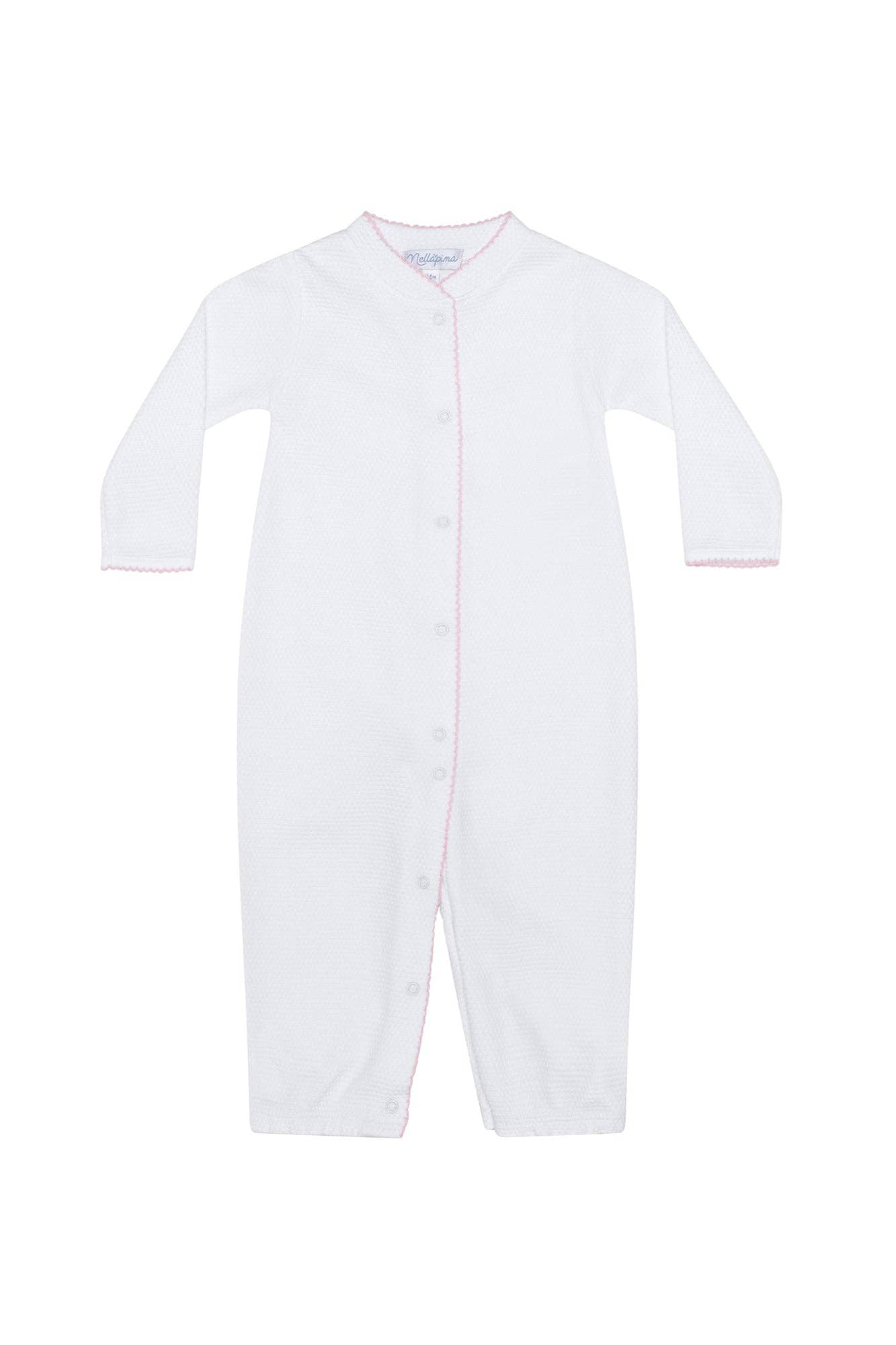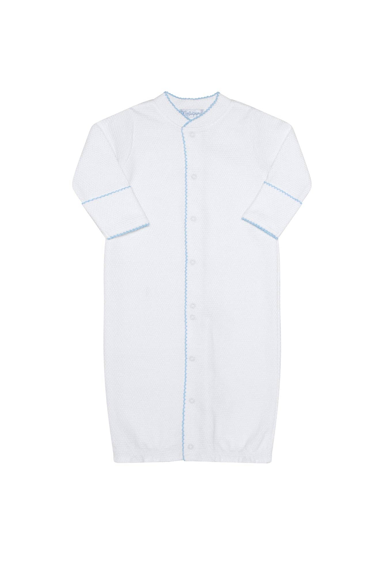 Our baby converter gown is a real lifesaver for parents! With a simple snap change, it effortlessly transforms from a cozy gown for bedtime to a playful playsuit for daytime. Created from our remarkable White Bubble fabric and featuring Picot Trim details in three stunning colors: Pink, White, or Blue.