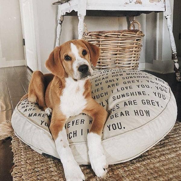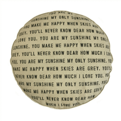 This charming floor pouf also doubles as a dog bed! One side has large black polka dots, while the other says, "You are my sunshine my only sunshine. You make me happy when skies are grey. You'll never know dear how much I love you."