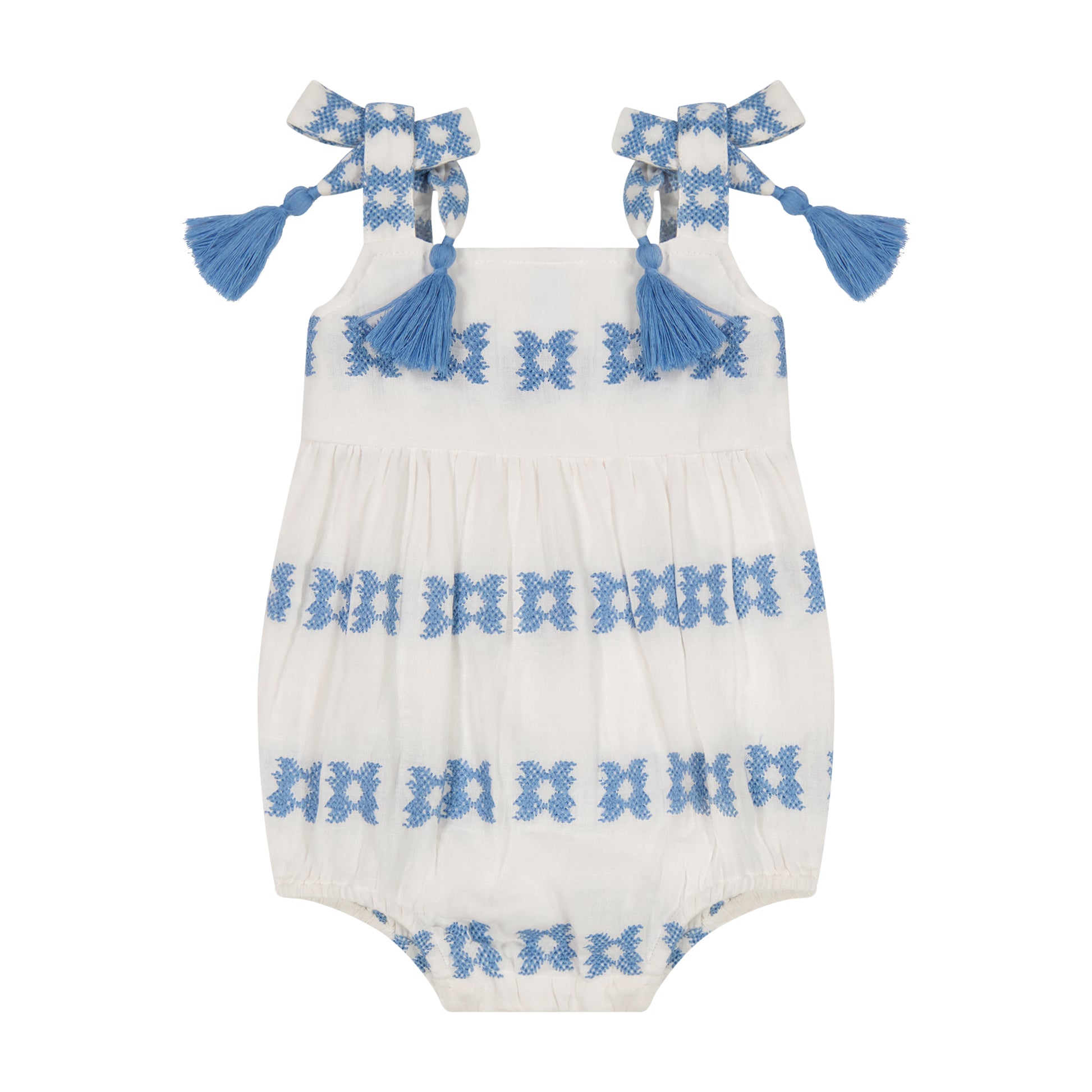 Zoe Baby Romper in crisp white with delicate blue embroidery details. This charming one-piece romper features a comfortable fit perfect for everyday wear and special occasions. Soft, breathable fabric keeps little ones cool and content. The thoughtful embroidery adds a touch of sophistication to a timeless silhouette. Ideal for babies who love style and comfort combined.